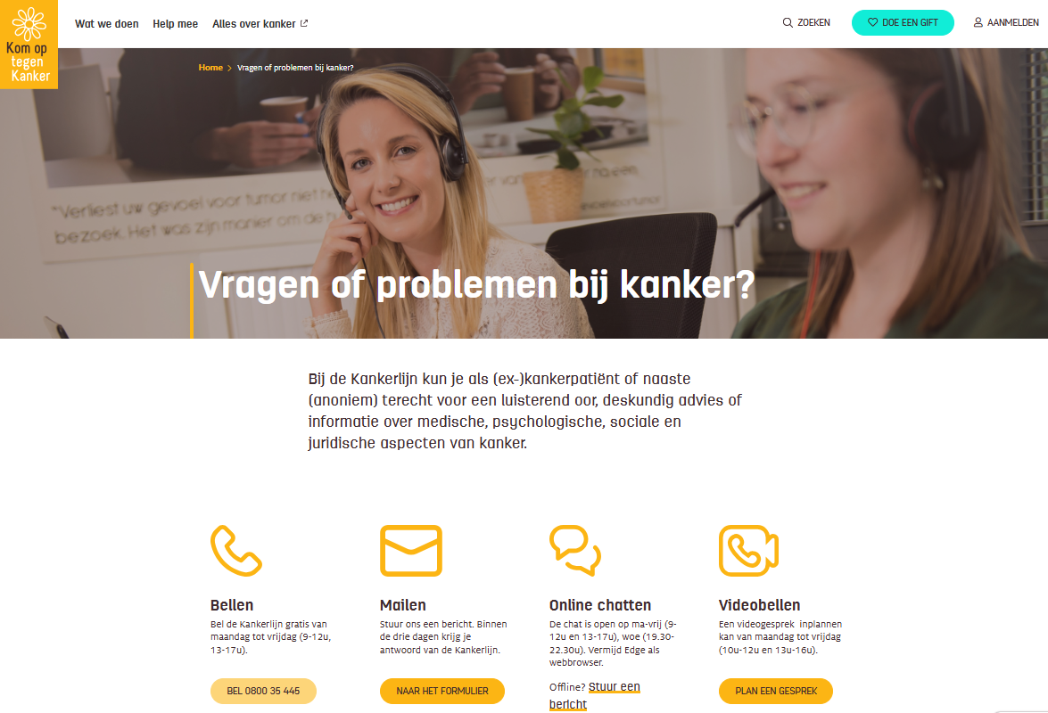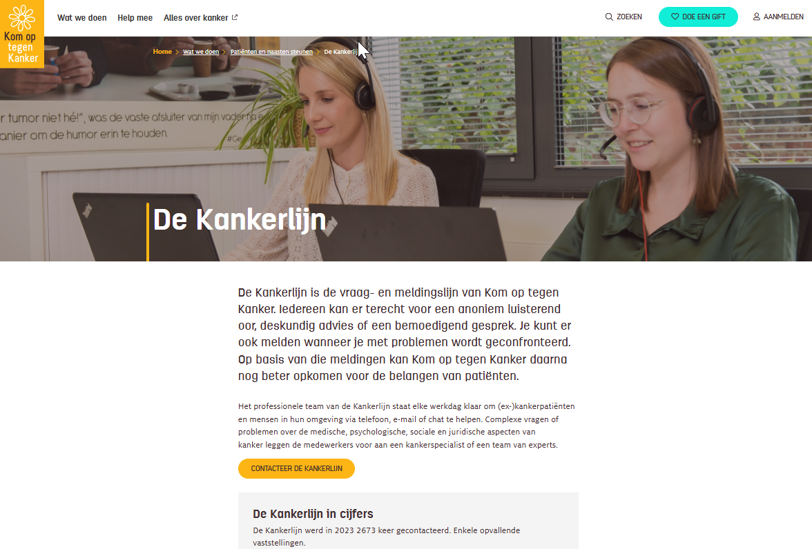 Bij de Kankerlijn kan je als (ex-)kankerpatiënt of naaste anoniem terecht voor een luisterend oor, deskundig advies of informatie over medische, psychologische, sociale en juridische aspecten van kanker.